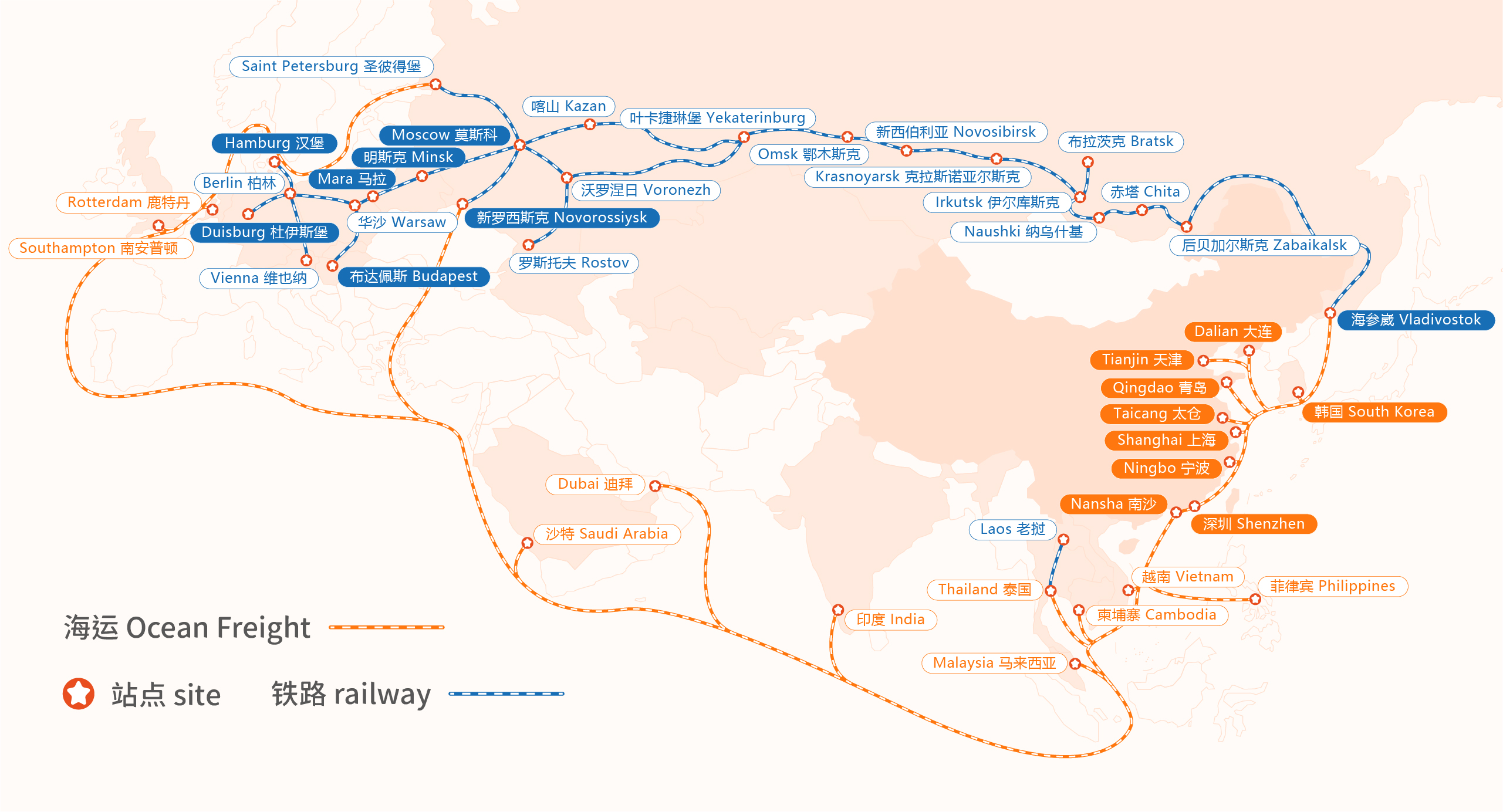 諾瓦在海參崴、新加坡等地設立了分公司,多式聯運服務網絡覆蓋歐亞地區主要貿易通道和市場,能夠實現跨境運輸的暢通無阻。